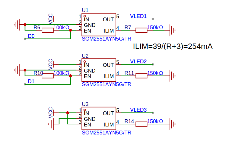 The 3 output channels (VLED1, VLED2, VLED3) use SGM2551A precision current-limited power switches to deliver up to 254 mA but cannot be dimmed. VLED1 and VLED2 are controlled by XIAO ESP32-C5 pins D0 and D1 respectively, while VLED3 lacks GPIO control.
