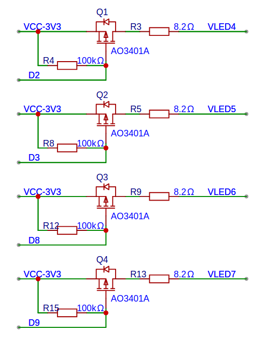 The 4 output channels (VLED4, VLED5, VLED6, VLED7) support full PWM dimming via XIAO ESP32-C5 pins D2, D3, D8, and D9 respectively, delivering up to 80 mA per channel through AO3401A P-channel MOSFETs.