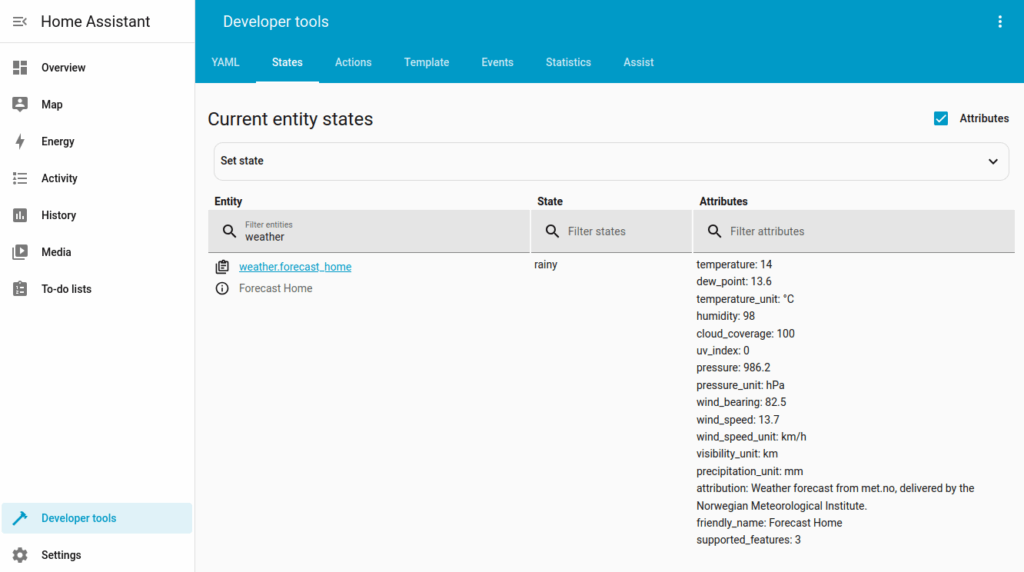 We will first check which information are provided by this integration, using States tab of developer tools. Enter weather as filter, you can see that this entity has weather condition as state (rainy) and several attributes (temperature, dew_point, temperature_unit, humidity…).
