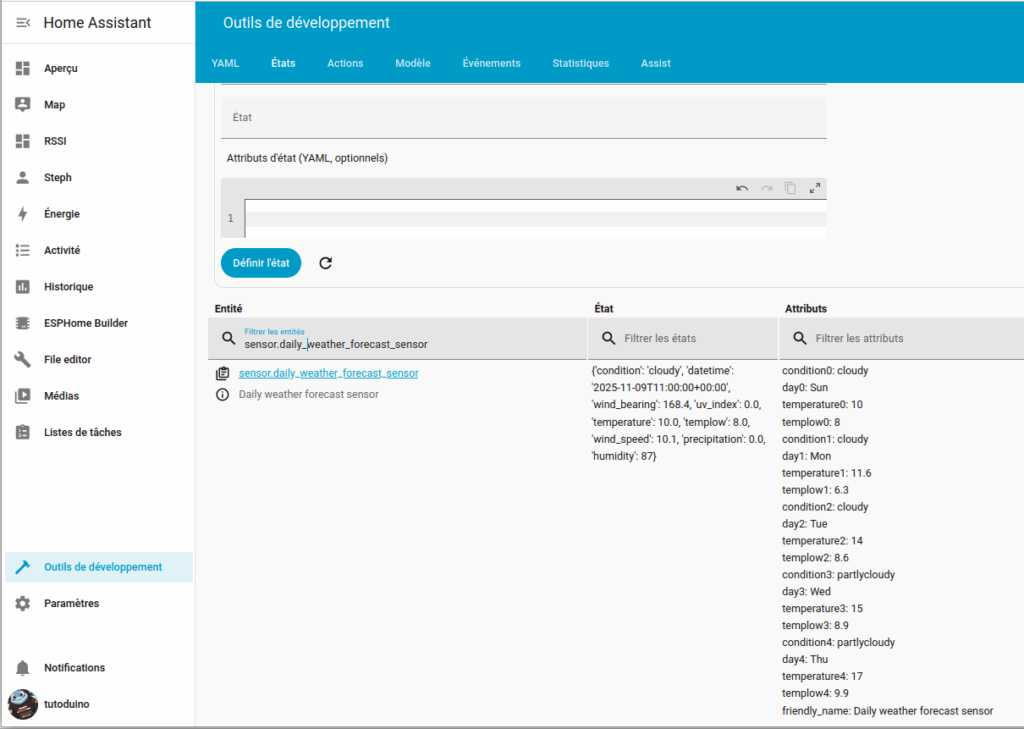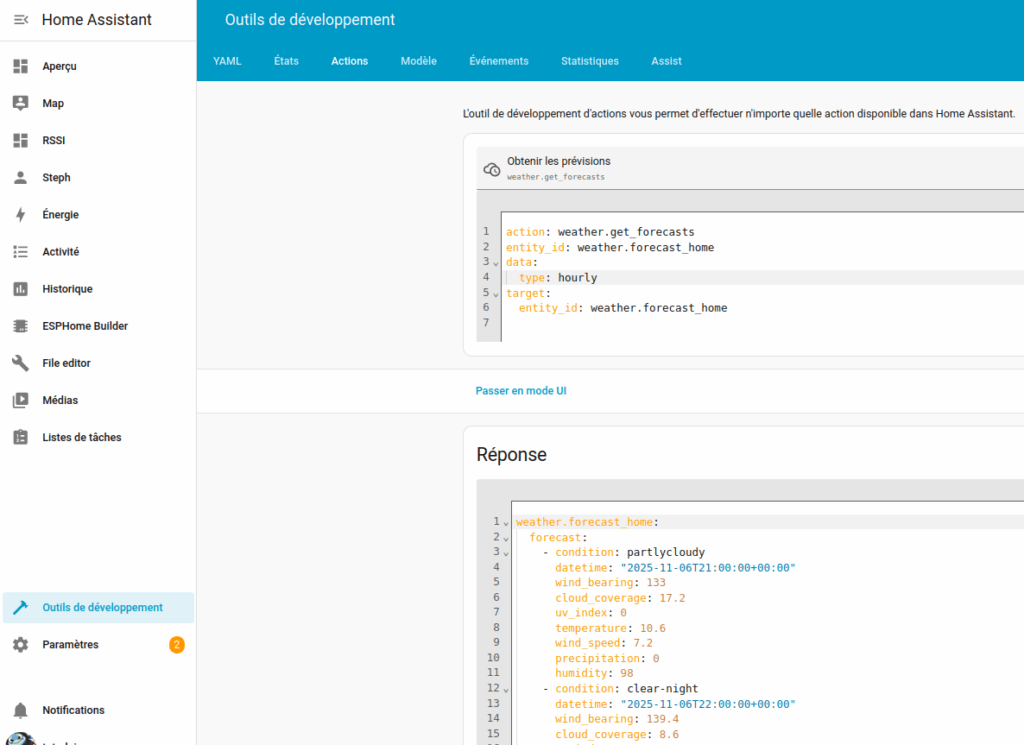 As we will see later, we do not see the weather forecast information. Indeed weather forecast are not attributes from weather.forecast_home sensor and must be requested by weather.get_forecasts action on the weather.forecast_home entity.