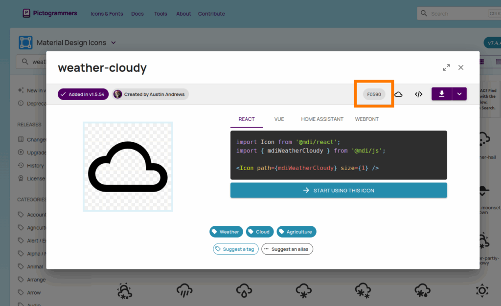 I chose to display the icons using the materialdesignicons-webfont.ttf font instead of images. You’ll need to download this font and place it in the ESPHome fonts directory using a File Editor add-on, for example. To choose your own icons, you can use the pictogrammers.com website and note the reference number of the desired icon.