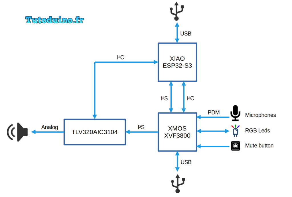 - ESP32-S3 ↔ I²C : XVF3800 (configuration)