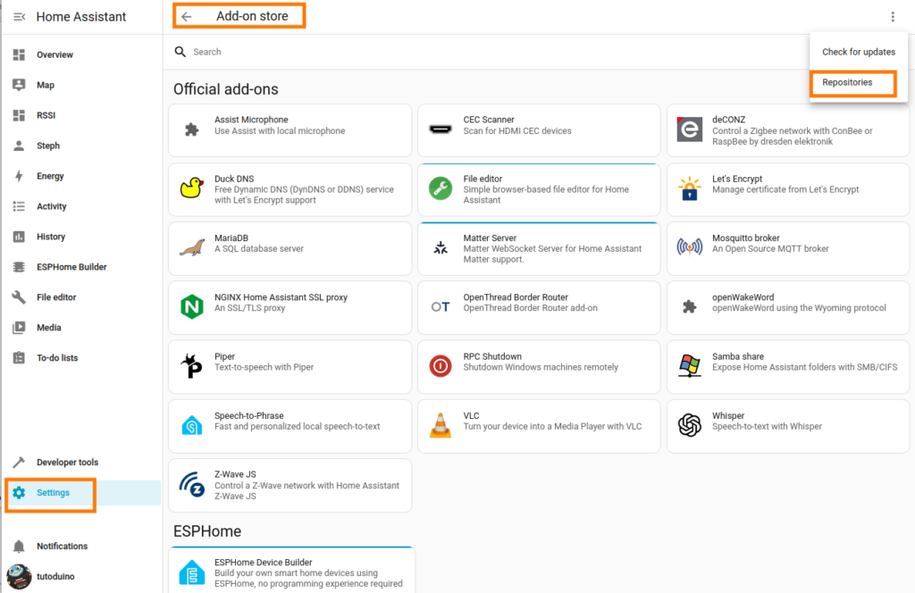 https://github.com/rhasspy/hassio-addonsTo do so, you must add this repository from the Repositories menu, accessible via the three‑dots menu in Settings → Add‑ons → Add‑on store.