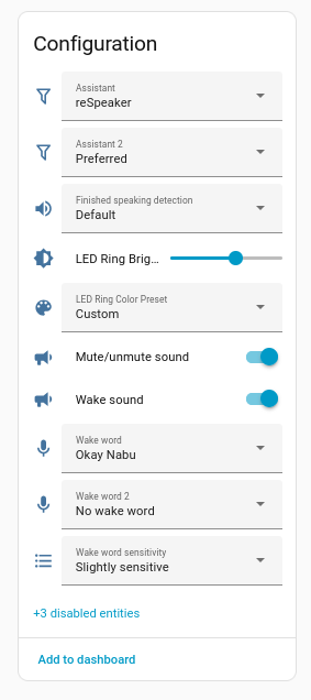 You have now to configure this device. Select the voice assistant configuration you created for the ReSpeaker, then choose a wake word (for example, “Okay Nabu”). When the wake word is detected, the ReSpeaker wakes up and listens for your voice command.