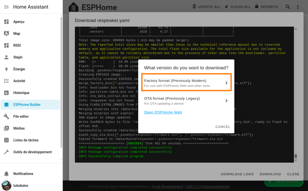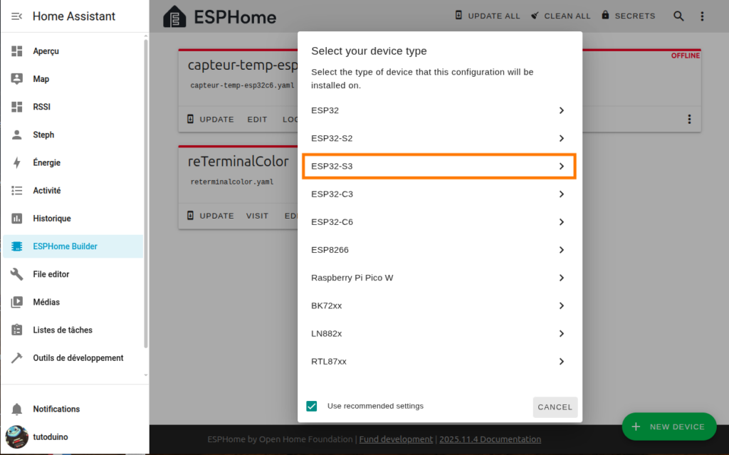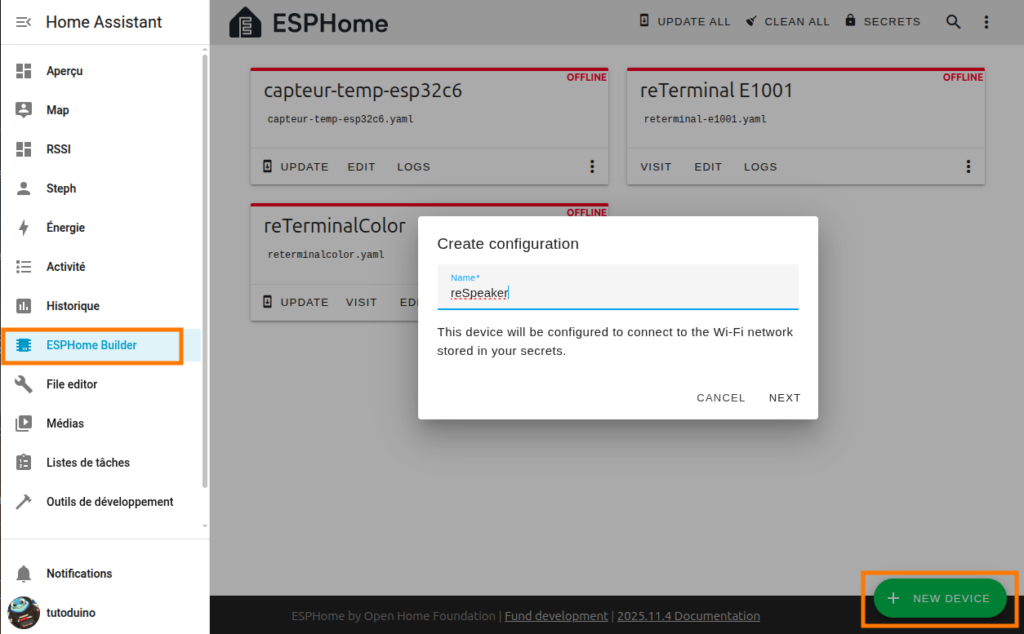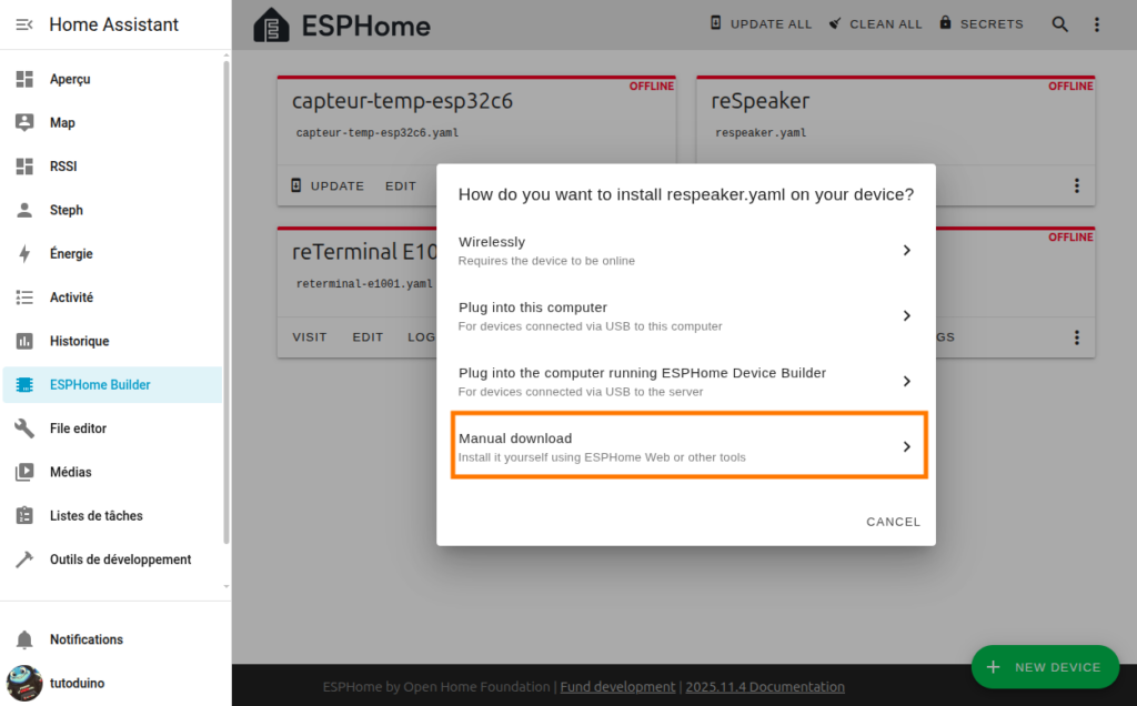 The first step is to integrate the ReSpeaker into ESPHome and to manually upload the initial ESPHome firmware into its ESP32-S3.