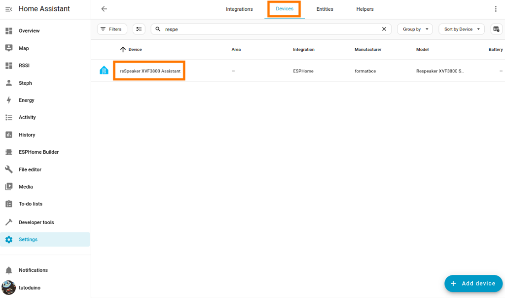 Once the configuration is compiled and uploaded to your ReSpeaker XVF3800 device, it appears in the list of Devices.