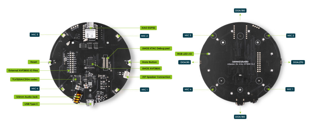 The XMOS XVF3800 features cutting-edge algorithms like multi-adaptive beamforming, acoustic echo cancellation (AEC), de-reverberation, noise suppression, direction-of-arrival (DoA), and voice activity detection (VAD) for clear voice pickup in noisy environments.