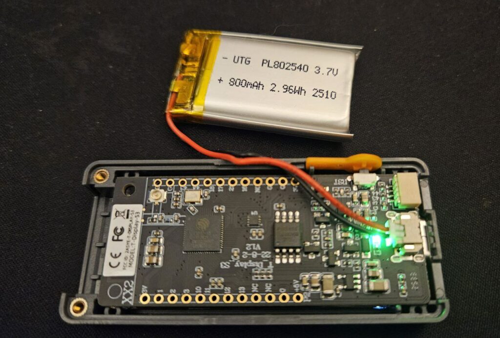 Le Lilygo T-Display S3 peut être alimenté par une batterie Lithium-Ion de 3,7 V par son connecteur JST PH 2.0 (JST 2 broches avec un pas de 2 mm). Une batterie de 800 mAh peut être positionnée à l’intérieur du boîtier.