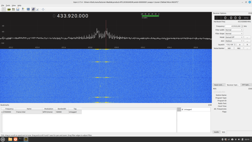 sudo apt install gqrx-sdrUne fois le dongle relié au port USB du PC, lançons le logiciel gqrx pour partir à la découverte de la radio logicielle.