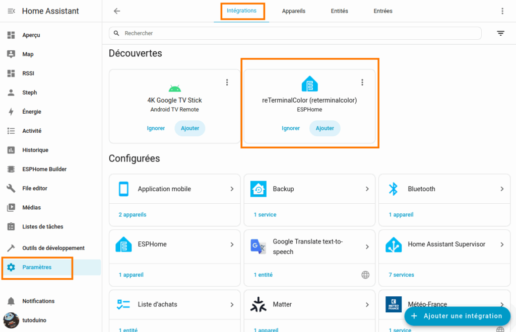 Pour accéder aux données de Home Assistant, vous devez ajouter l’intégration de votre appareil ESPHome depuis le menu Paramètres > Intégrations. Il devrait être disponible dans la section Découvertes.