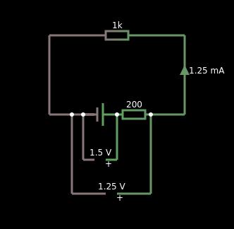 Dans l’exemple ci-dessous, la résistance interne de la pile est de 200 Ω. On observe que lorsque la pile ne génère pas de courant (interrupteur ouvert), la tension aux bornes de la pile est de 1,5 V. Si on ferme l’interrupteur, la pile génère un courant de 1,25 mA et on observe que la tension à ses bornes chute à 1,25 V (c’est la tension indiquée en bas du circuit, aux bornes de la pile incluant sa résistance interne de 200 Ω).